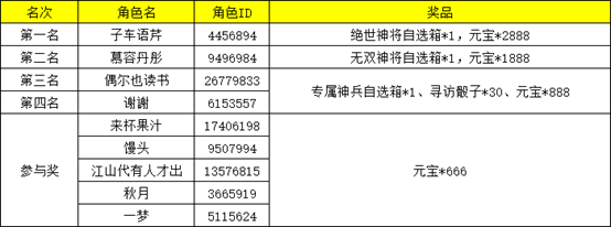 让我们恭喜以上九位获奖的主公,所得奖励将于3个工作日内通过邮件发放至各位主公的邮箱,记得注意邮箱领取你的活动奖励哦! 再次感谢每一位主公的支持和参与~