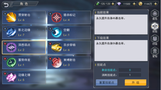 接下来的所有被动技能都是为了打伤害而存在,正是因为这些被动加持让伊娃的输出比其他角色高出好几个档次,第一个是洞悉弱点,洞悉弱点能够提升伊娃自身的暴击几率,并且技能等级越高提升暴击率就越多。