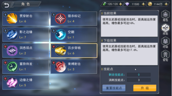第二个是百步穿杨,当使用主武器或者使用技能攻击时会随着与敌人的距离拉大而伤害越高,因此伊娃需要时刻保持与敌人之间的距离,这样可以大幅度提高伊娃的伤害。