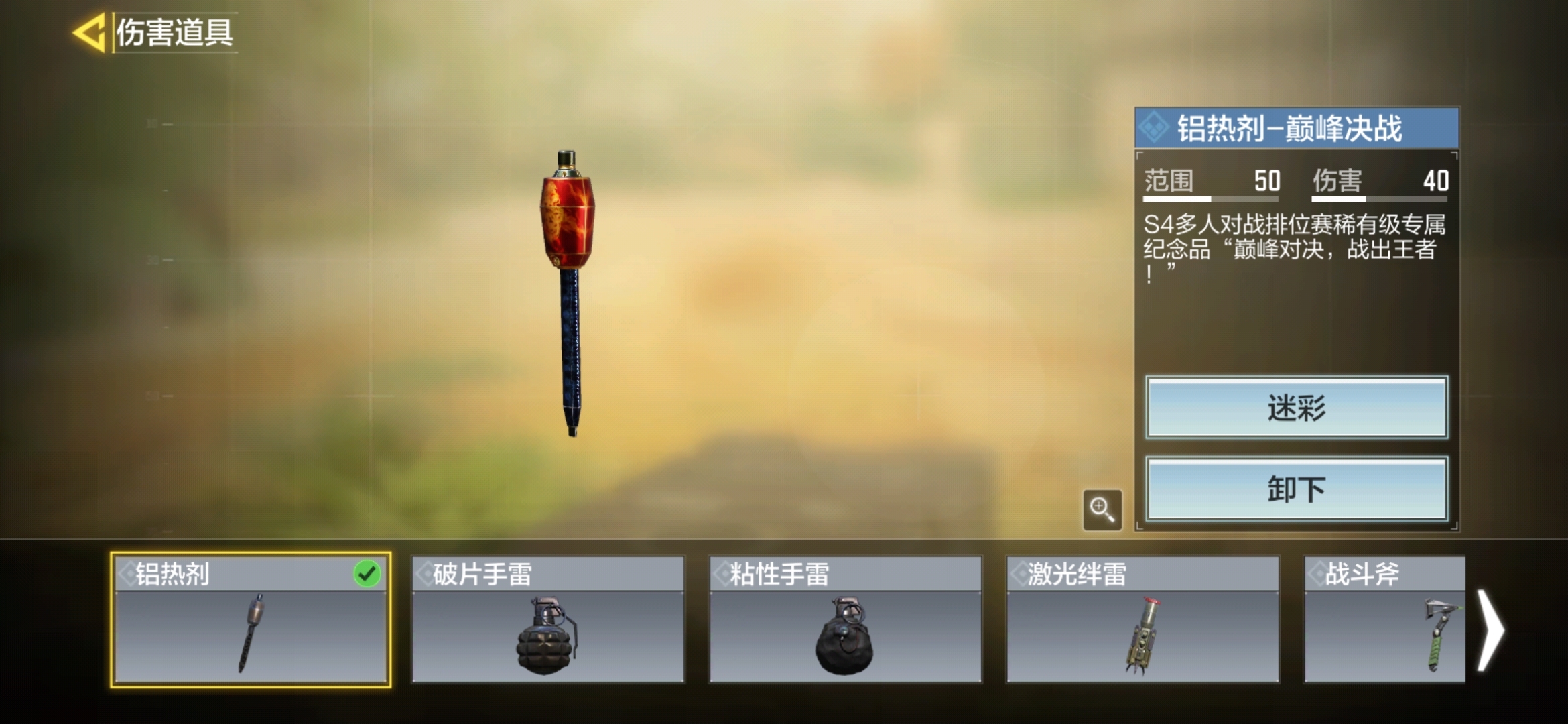 2,在敌方的拦截道路上丢燃烧瓶或者是铝热剂。这里推荐铝热剂,因为铝热剂具有减速效果。