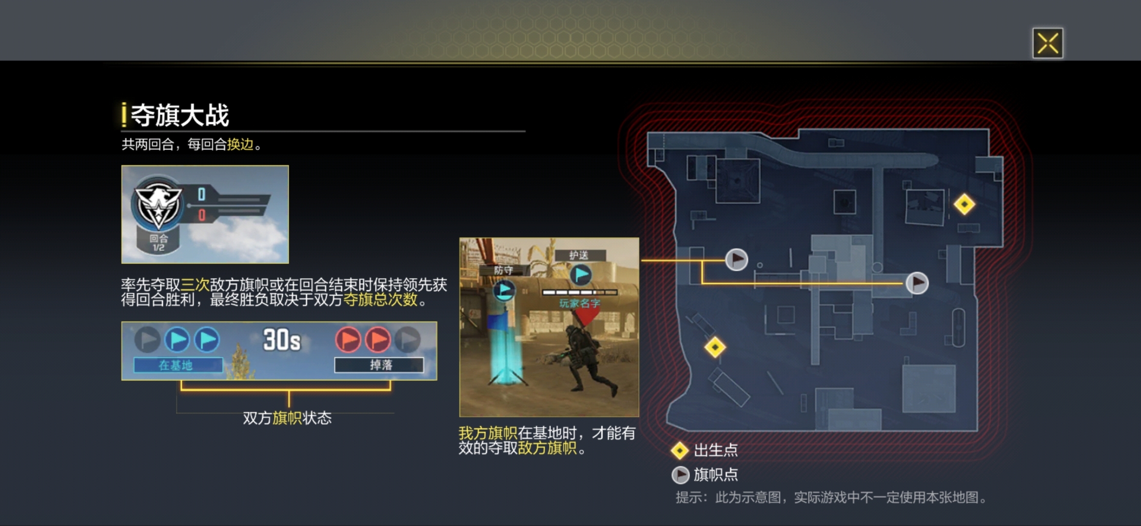 首先,官方给出了这样的定义:率先夺取三次敌方旗帜或在回合结束时保持领先获得回合胜利,最终胜负取决于双方夺旗总次数。(且只有我方旗帜在基地时,才能有效的夺取敌方旗帜)。