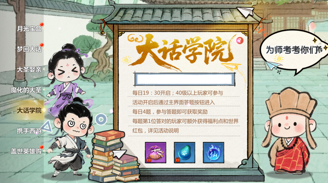 受到魔气感染的大圣将在活动指定时间内出现在云灵山,请全服玩家前往镇压!另外,对大话西游电影有所了解的蜀友可有福了,大话学院问答活动上线,每日答题获得超值奖励,其中大部分问题与大话西游电影有关,没有把握的话也可以再看看电影回顾一下哦。