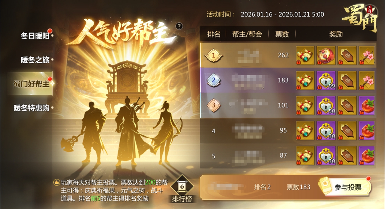 票数达到200票的帮主可获得元气之树、战斗道具自选包和祈福果实;而最后也将根据投票排行榜为