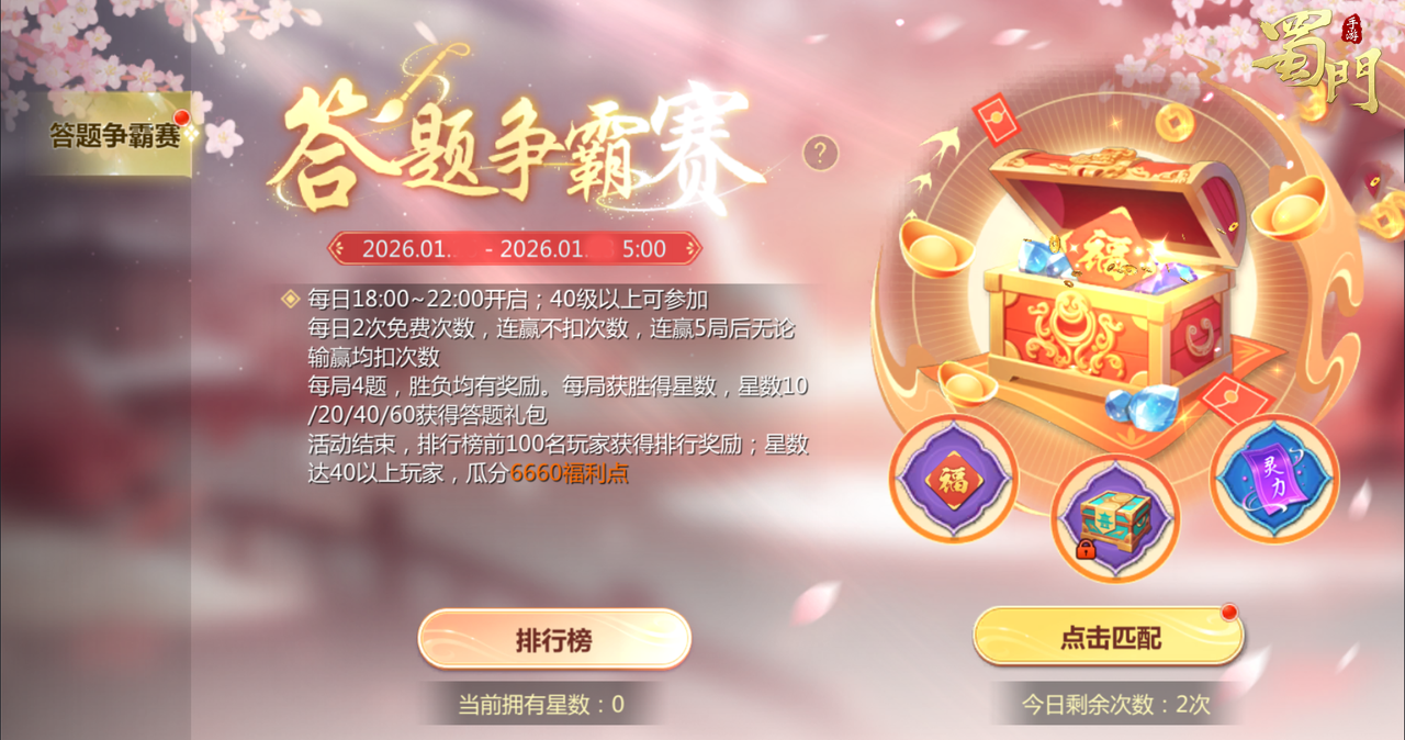 活动结束后,排行前100名的蜀友还将额外将获得包括限时的【才高八斗】称号、珍稀资源自选包、金灵仙灵草、仙魂在内的额外排行奖励。