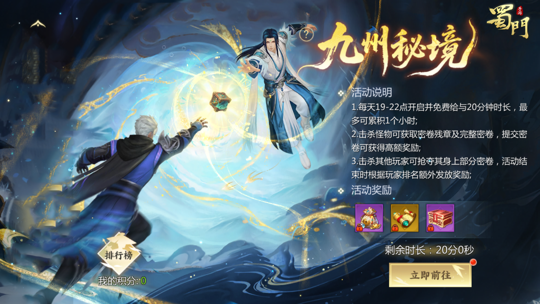 活动内容:传送至活动场景,在指定时间内参与击杀怪物和其他玩家可获取密卷残章及完整密卷。提交密卷可获得积分及经验、灵力,每累计5积分将获得九州宝箱*1,打开后概率获得永久时装