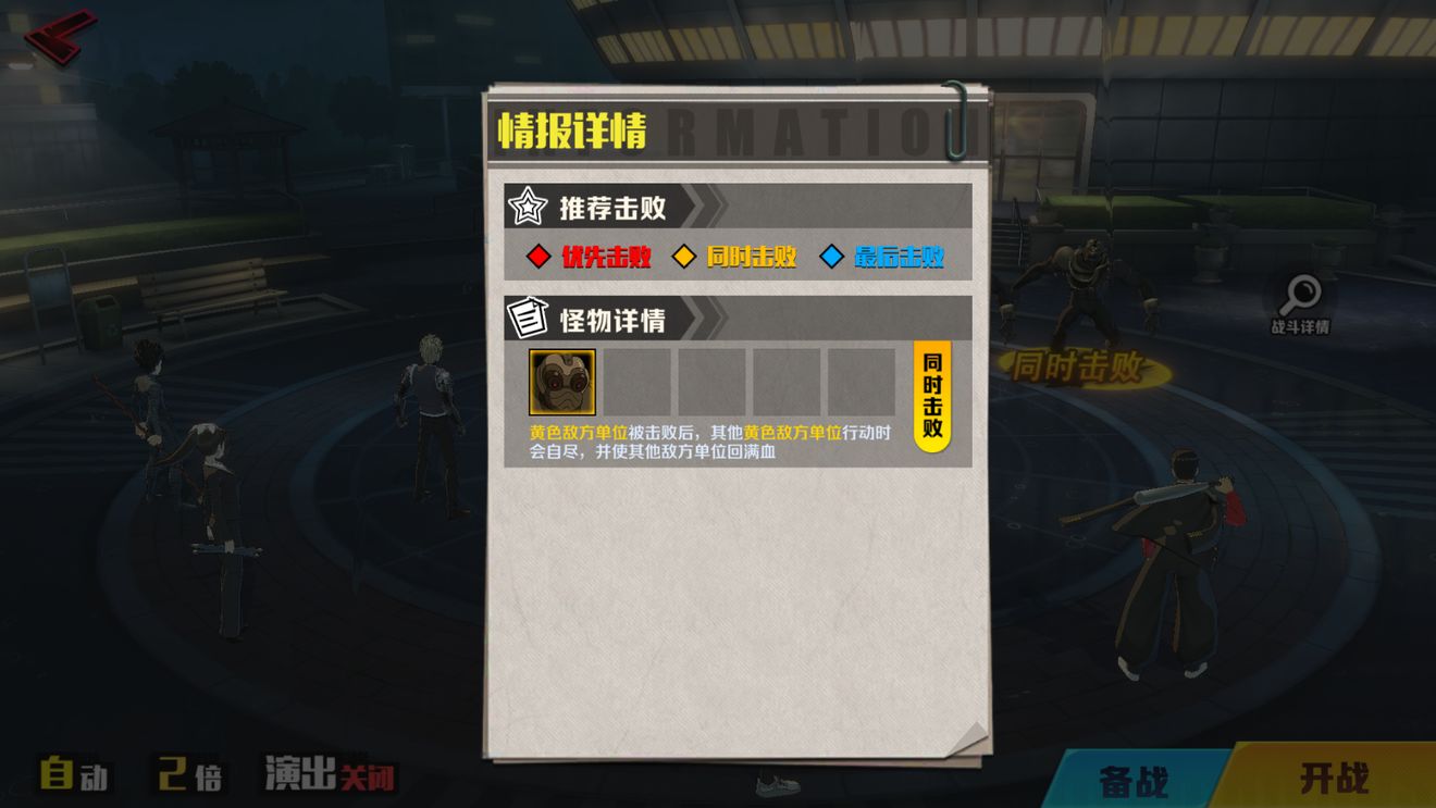 当你在场上看到这些提示时,需要根据文字的描述去打。比如说如果你不同时击败对手,那么可能其中一个会在另一个被击倒后释放出一些额外的buff来增加我们打怪的难度。还有一些对手,如果你把【最后击败】的先打倒了,那么我方就会被集体眩晕,但如果你根据提示击败了【优先击败】的对手,那么可能一些debuff就会被加在对手身上了。