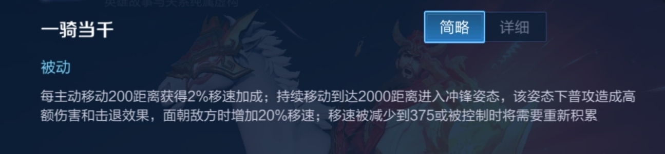 关羽每持续移动4 5秒会进入冲锋姿态;当关羽的移动速度受到控制效果或减速时将退出冲锋姿态;关羽面朝敌方移动时将增加20%移动速度