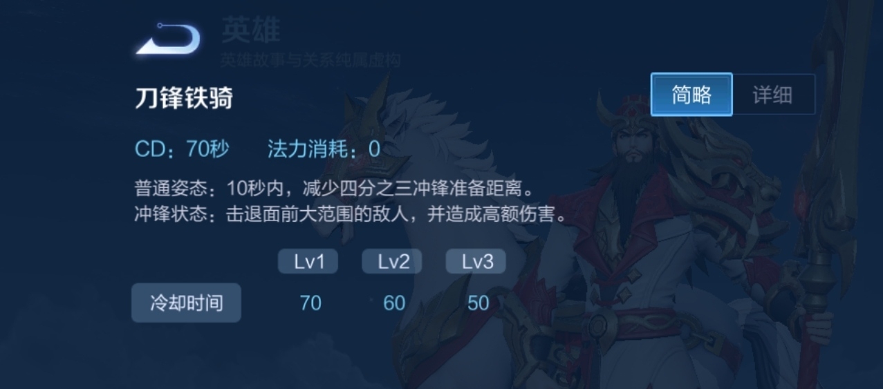在普通姿态的时候使用它可以减少准备距离,在冲锋状态下使用关羽将召唤铁骑向前方突击撞退敌人并造成伤害。