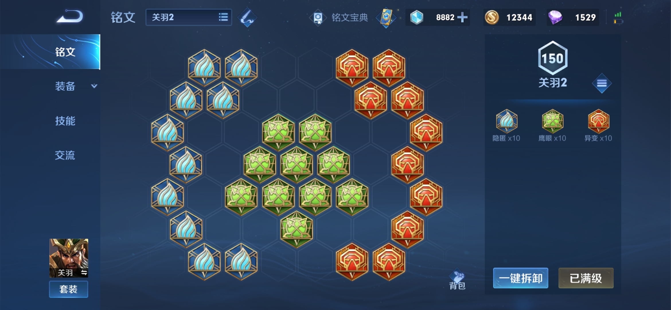 10隐匿,10鹰眼,10异变,这套铭文可以给关羽增加高额的物理穿透和移动速度可以说是一刀999