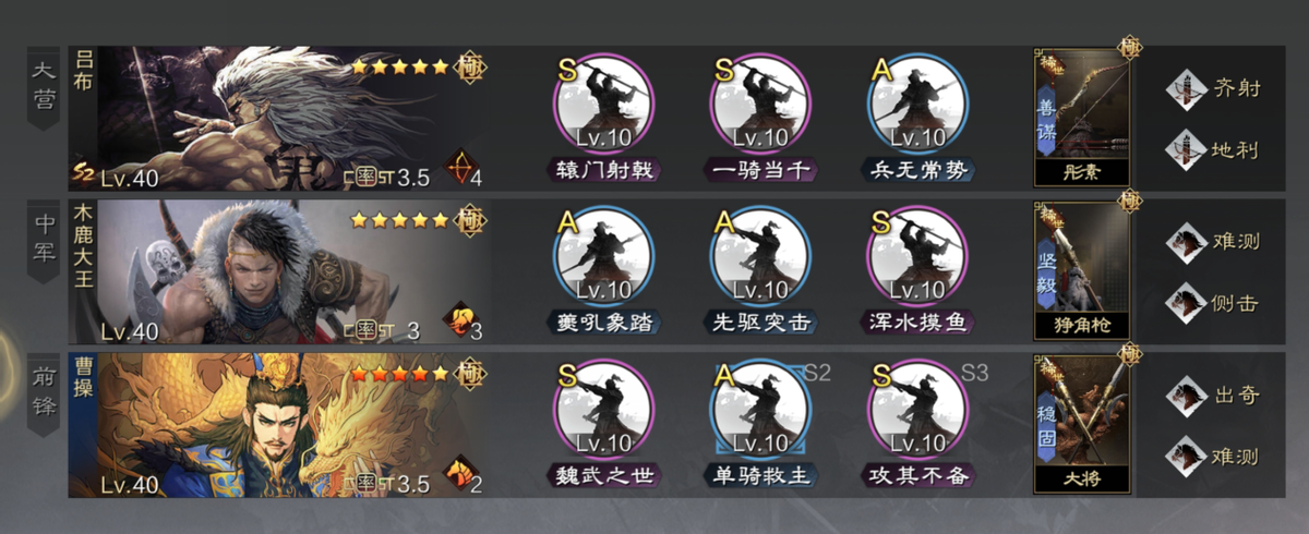 前锋曹老板带上宝物大将和单骑救主即可,撸铁队只需要保护大营就行了,带一个大将能省一个格子带攻其不备,木鹿能不能存活输出全看他的造化。