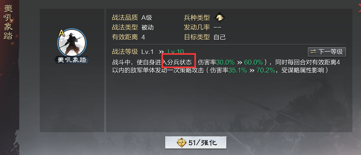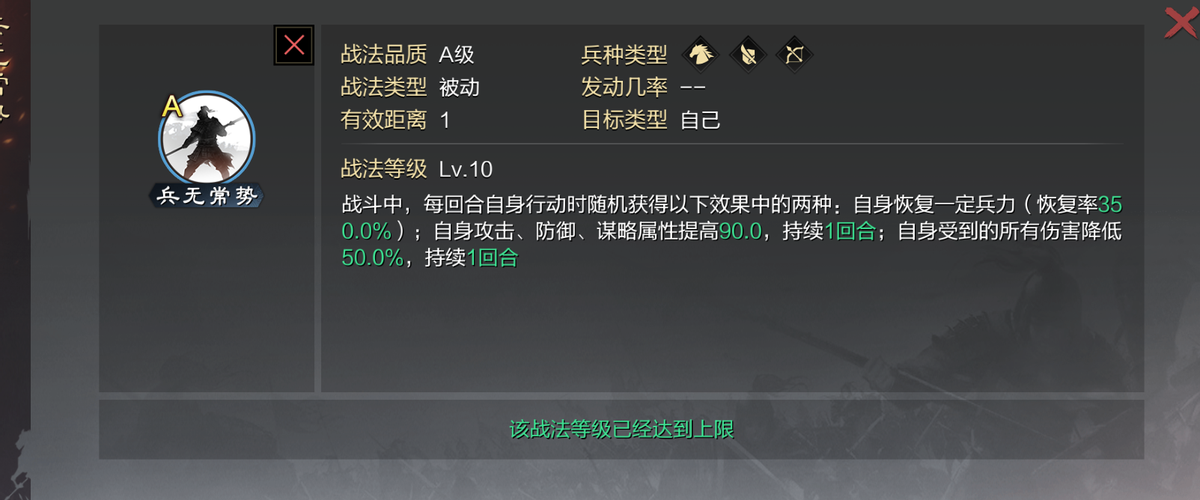 自从兵无常势改版加强后也是大火,直接变成了物理输出大营的常用战法,高额的回复量、三维的提升以及50%的伤害减免,每回合能触发两个,虽然一骑击势是传统物理输出大营的标配,但都是要么靠着始计能叠更高的爆发或者有网红双减保大营的情况下才带击势,这队很明显兵无常势更加的给力。可谓是全方位提升大营的输出能力和生存能力,例如90的属性提升就需要9红才能做到。