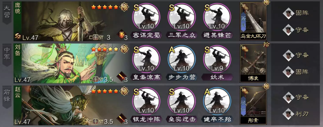 这是非常经典的蜀步玩法,赵云充当前锋,配合一系列的减伤战法、控制战法、恢复战法来保障生存,依靠赵云和月英来打伤害。