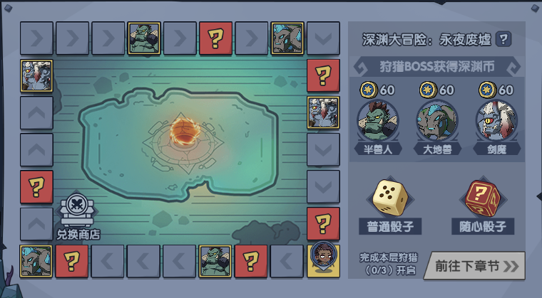 根据每次骰子数,移动对应格子,达到指定首领格子完成狩猎,狩猎全部指定首领后即可跨越下一章。从永夜废墟到血环山脉,海量奖励相送。