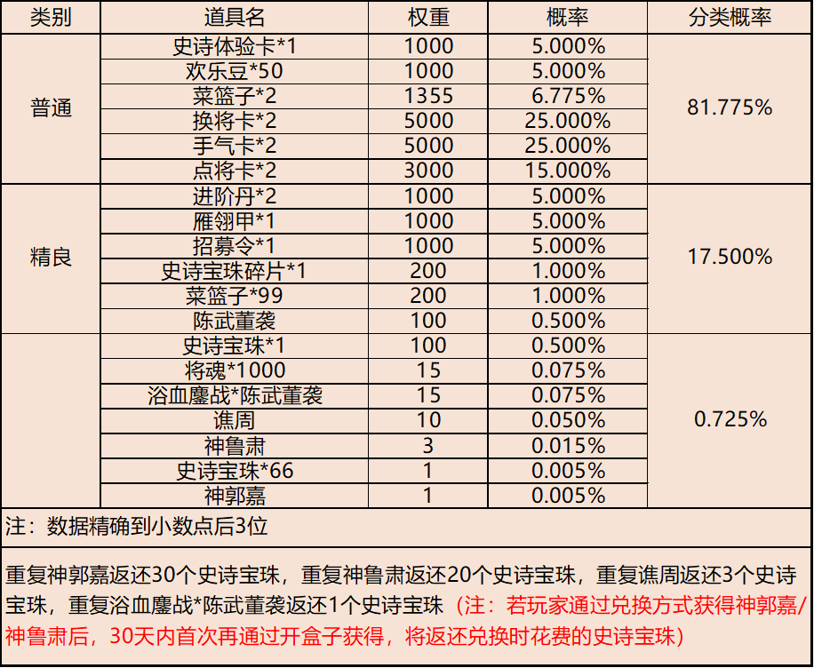 打开必得将魂*2、雁翎*20、心愿积分*1,额外几率开出以下道具:
