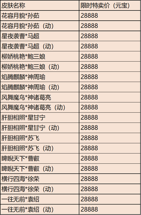 皮肤狂欢购更新,本期上架以下特价皮肤: