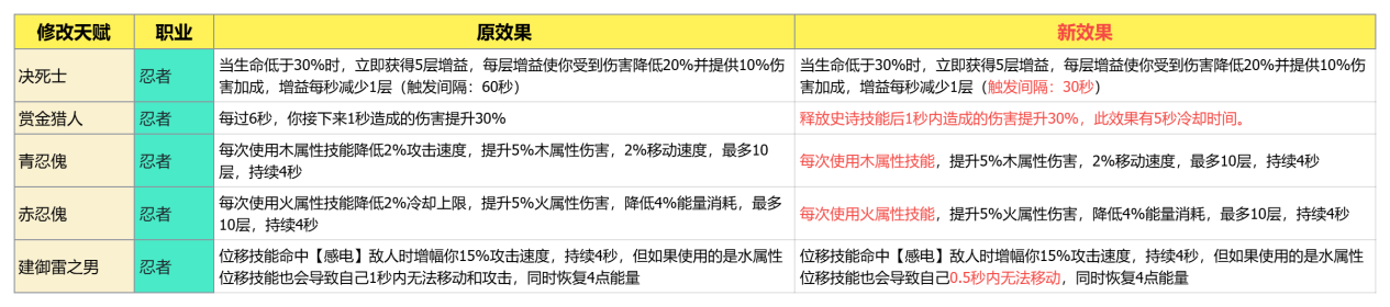 忍者的很多天赋在提供增益的同时带来了一些不容忽视的负面效果,甚至有的会影响整套BD的运转,例如【赤忍傀】的降低冷却上限就会让需要冷却的BD望而却步,例如【赏金猎人】每六秒自动提供的一秒伤害加成很难卡在战斗轴中。我们特别去优化了这些天赋带来的负面体验,尽可能减少对玩家操作和构筑的影响,让玩家拥有更多主动性。