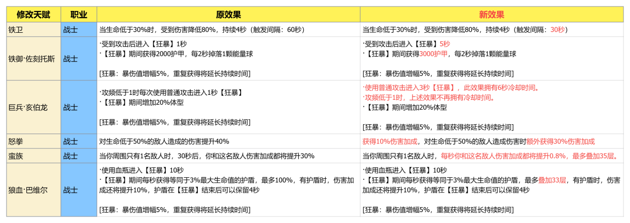 我们调整了些许与狂暴相关的天赋,让一些触发狂暴机制较难的天赋更容易触发狂暴,使其不再是一个单纯的提供狂暴期间额外增益的挂件,例如将【铁御】触发的狂暴持续时间提高到了5秒,让【巨兵·亥伯龙】有通常途径触发狂暴的可能,不再需要严格的低攻频条件。