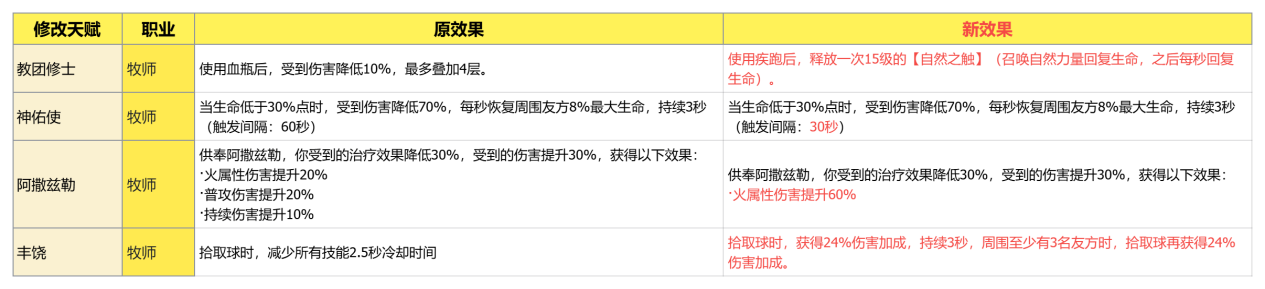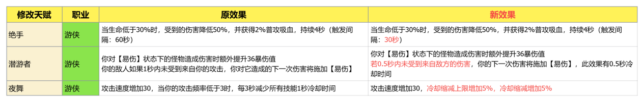 为此,我们通过论坛,Q群等渠道收集了勇者们对于天赋调整的建议,对各职业天赋进行了一些调整,并通过测试服收集调整反馈进一步优化,以保证这些天赋调整都是能让玩家实际受益的。