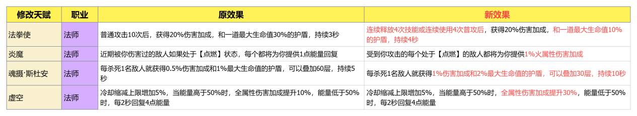 法师有许多天赋因为苛刻条件在现在几乎不能出现在玩家的天赋盘中,我们针对性地去对一些玩家反馈很多的天赋进行调整,包括优化【法拳使】的触发逻辑,提高【魂摄·斯杜安】的覆盖时间等等。我们在测试服还对此前呼声很大的【奥咒】进行调整,试图让这个天赋能够趋向更稳定的收益,不过在经过测试服反馈之后我们了解到此调整仍存在部分数值体验问题,所以对【奥咒】的调整方案仍在持续探索中,新版本暂不做调整。