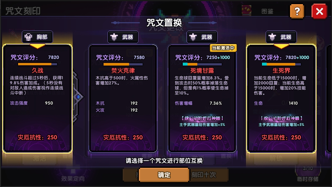 新增咒文置换功能,已保存在武器、胸部、项链中的咒文可通过置换功能,零损耗与其他部位咒文位置进行互换