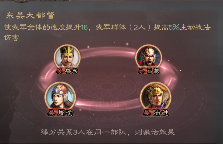 通常指成型队伍的简称,“东吴大都督”缘分队伍,是指周瑜、陆逊、鲁肃、吕蒙四人组成的队伍。