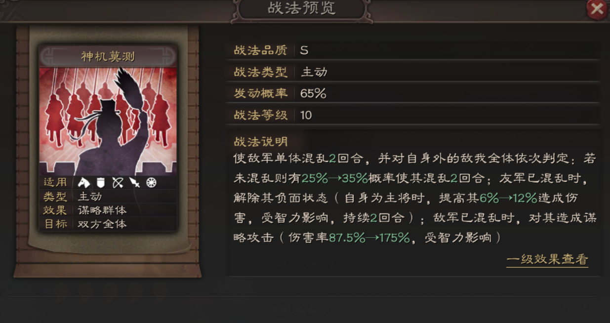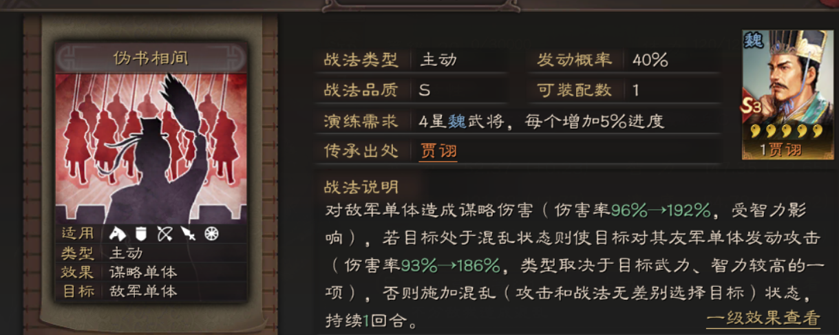 使敌军单体混乱两回合的同时,对除自身外的敌我双方依次判断:若都无混乱效果,则有35%几率使之混乱2回合;若友军有混乱效果,则解除混乱并提高伤害,持续2回合;若敌军有混乱效果,则造成高额谋略伤害。这里要说明的是,神机莫测对敌军的单体混乱和判断效果是同步进行的,因此在本回合内被神机莫测混乱的敌军是不会受到第二段谋略伤害的。神机莫测发动率65%,仅次于貂蝉自带战法闭月,这从某种程度上保证了贾诩不会非常“演”。稳定的敌军单体混乱和35%概率的敌我双方混乱,搭配判定后的己方增益及对敌军造成的高谋略伤害,使得有贾诩的队伍不会缺伤害但会变的不可控。2、传承战法【伪书相间】