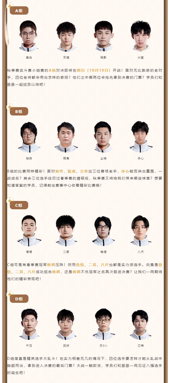 武斗赛小组赛即将打响,豚豚整理了这份对战名单,学员们快来看看你最期待的是哪一场比赛吧!