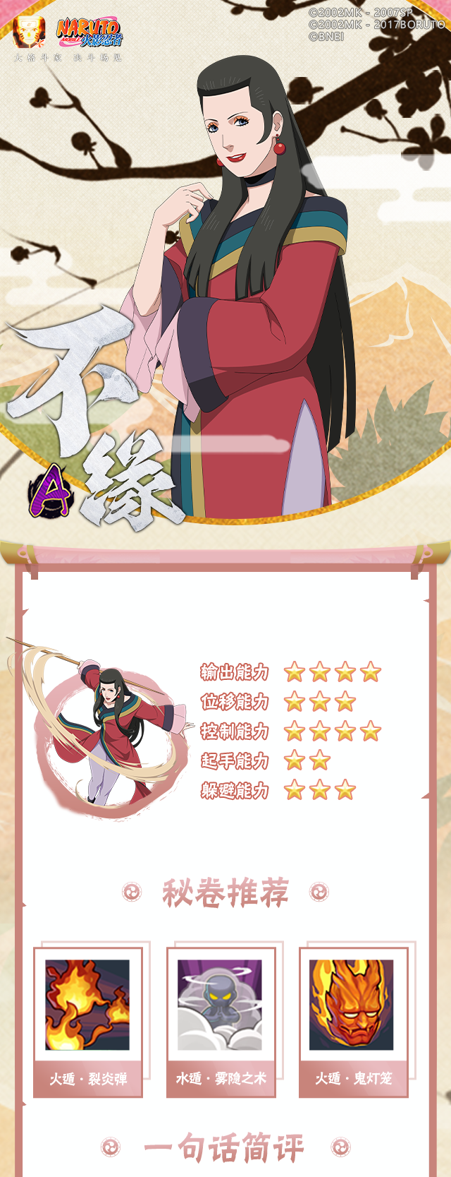 不缘的技能岩柱和普攻最后1A结合后能够进行长时间抓取,配合组合技打出高爆发;在实战中,还可以通过埋下陷阱,静待或勾引对手上钩,打出出其不意的效果。是一位适合打拉扯、擅长控制的忍者。