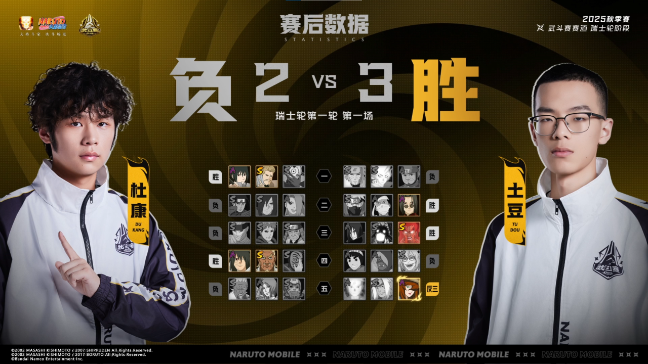 2025《火影忍者》手游秋季赛武斗赛瑞士轮第一轮第1场,杜康与土豆的对决十分精彩激烈。第一局杜康的“宇智波斑”「白面具」完美发挥,拿下首胜;第二局土豆骗掉杜康的通灵,再抓住其失误替身的机会释放通灵兽螃蟹,随后乘胜追击,扳回一局;第三、四局双方不分伯仲,各自拿下一分;第五局土豆在不利局势下调整状态成功反三,土豆3:2杜康拿下胜利!
