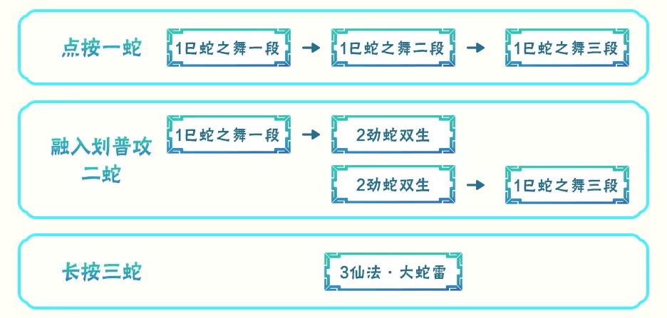 在点按释放一技能一段后,一技能二段划普攻可使用二蛇连续攻击;若直接释放二蛇攻击(一技能一段划普攻)后,在黄条结束前点按一技能则可释放三段攻击与敌人进行远距离拉扯。