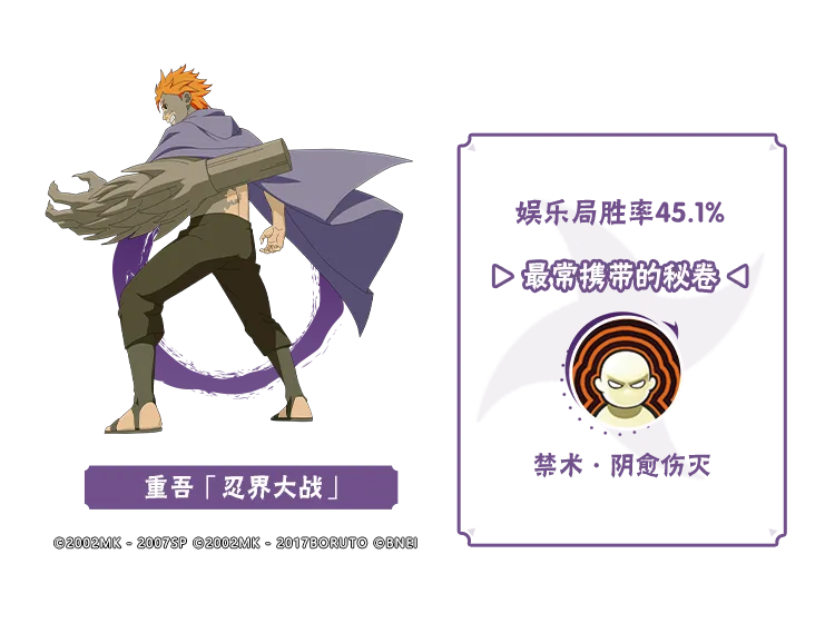 咒印化后爆发力量,能精准蓄力攻击的忍战重吾也在10月登场啦,快来看看他的战绩吧!