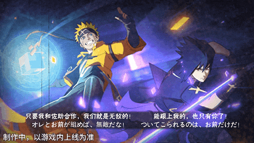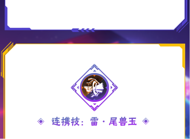 鸣人或佐助任意一方登场时,在二技能后摇点按奥义,将会消耗一颗奥义点,召唤对方一起打出连携技:雷·尾兽玉,鸣人凝聚尾兽玉,佐助召唤麒麟,两股力量合而为一向前发射,将敌人贯穿。结束后同样将自动切换为另一角色,并进入强化状态,使用任意技能后强化结束。