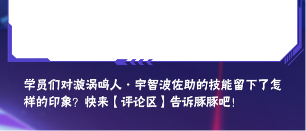 漩涡鸣人·宇智波佐助为双人作战忍者,学员们可以在忍者界面和备战界面选择登场的默认角色,战斗中点按奥义键可切换到另一角色(无需消耗奥义点),切换角色后对应的普攻、技能也会改变。鸣人和佐助共用技能CD,但双方独立血条,若其中一方血条耗尽则整场战斗都不可再切换角色。豚豚小提示:在角色静止、移动或普攻时都可点按奥义键换人,若在普攻时换人,打完当次攻击后原本的角色才会退场哦!