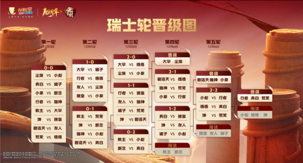 年总无差别瑞士轮分组赛中,大伞、小豪、行者、荒芜成功进入胜者组;真白、碧洛天、尘埃、鼬神则落入败者组。