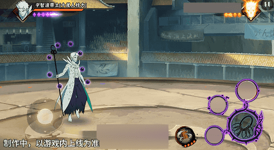 宇智波带土「十尾人柱力」使用锡杖操控求道玉对敌人进行攻击,然后瞬身将求道玉变化为各种形态对敌人进行打击,最后将左手求道玉与敌人一同推出引发爆炸。