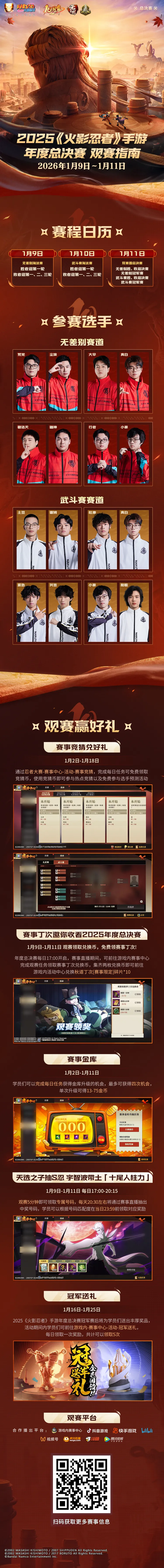 2025《火影忍者》手游年度总决赛的决赛阶段即将开启,1月9日进行无差别淘汰赛,1月10日进行武斗赛淘汰赛,1月11日的双赛道总决赛将决出双赛道最终的冠军归属。赛事期间,学员们在游戏内赛事中心参与赛事相关活动,即有机会获得秋道丁次「赛事限定」碎片*10、赛事限定头像框、赛事限定替身等丰富奖励,还有机会抽中高招S忍宇智波带土「十尾人柱力」哦!想了解更多详情的学员,快滑动查看下方的观赛指南吧!