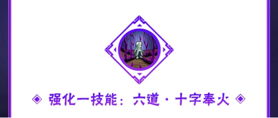 释放一技能划二技能,将打出强化一技能:六道·十字奉火,十尾带土背后的八颗求道玉砸落,形成十字形状的火焰攻击,并对普攻进行强化。豚豚小提示:强化一技能X轴范围较小,Y轴范围大哦!