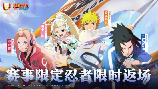 赛事忍者组团来为选手加油啦!即日起至1月11日12点期间,漩涡鸣人「赛事限定」、宇智波佐助「赛事限定」、春野樱「赛事限定」、山中井野「赛事限定」限时返场!学员们和鸣人、佐助、小樱、井野一起,为比赛应援吧!