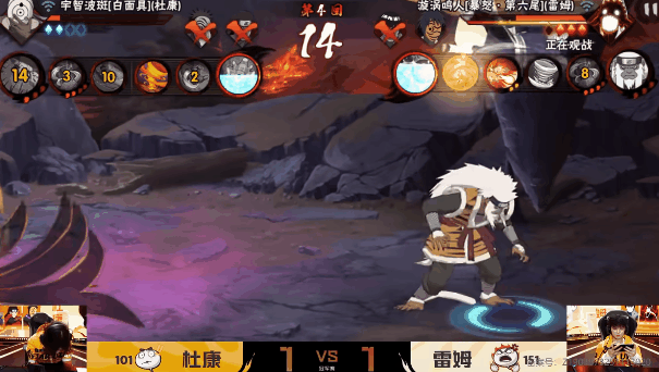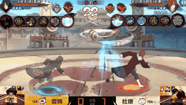 第二局,雷姆使用大蛇丸「晓」灵活走位,并用技能占据优势,最后雷姆击败杜康成功扳回一局。