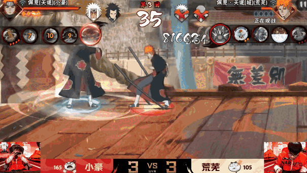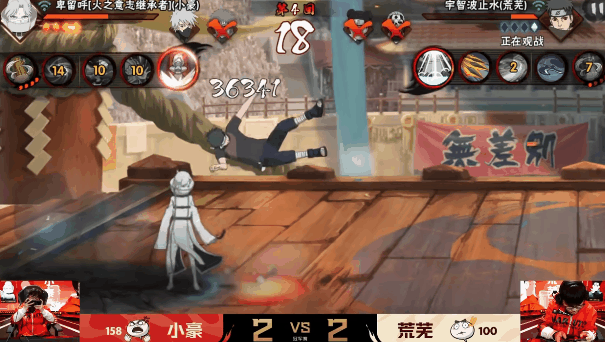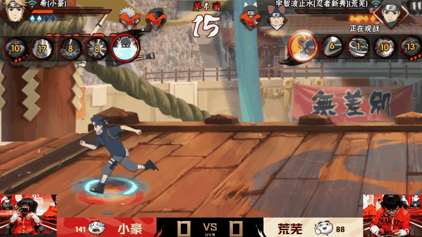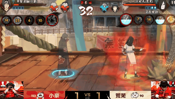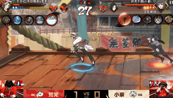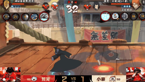第一局,小豪开局不利,被荒芜带走两名忍者,随后荒芜抓住机会使用奥义斩杀,率先拿下首局。