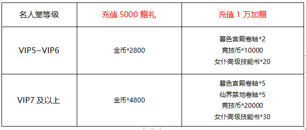 活动时间内,所有线下名人堂VIP5及以上玩家,在活动期间内的充值,达到要求后可以获得额外奖励哟!(只能领取对应VIP等级奖励)~