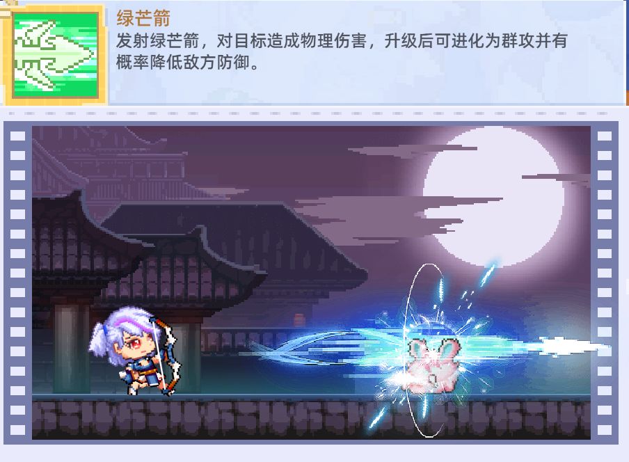 发射蕴含自然能量的绿芒箭,对目标造成物理伤害;随等级提升,可进化为群体攻击,并有概率降低敌方防御。