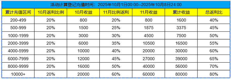 活动时间内(共8天),所有用户都可以参加,充值达标即可在10月31号和11月30号之前每月获得对应的彩晶返利,奖励将由邮件发放,共发放2笔。