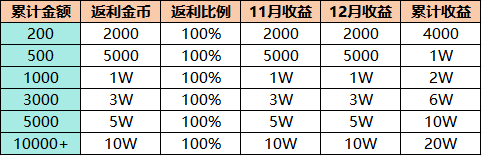在10月1日—10月9日内进行累计充值,且达到对应金额,就可以在接下来的两个月享受到100%的金币返利。