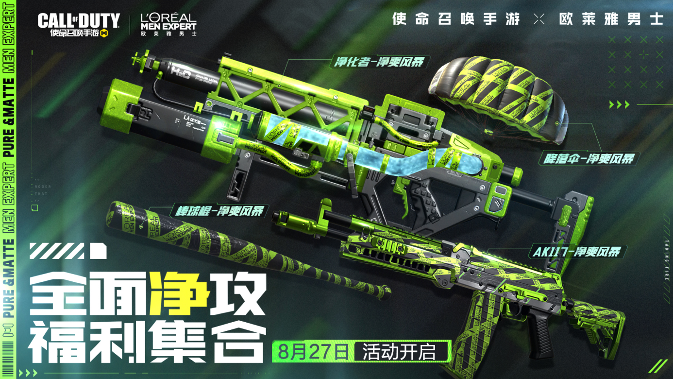 梦幻联动再度来袭!激情投入游戏后,总是感觉脸上油油的,黏糊糊格外不舒服?使命召唤手游携手欧莱雅男士洗面奶震撼来袭,保护战士们英俊外貌,清洗奋战后的疲劳,净爽冲!还可免费获得全新终极技能:净化者-净爽风暴哦!