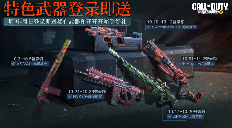 ● 【周末登录礼】再度降临,周末登录游戏,领取稀有级武器Switchblade X9-灼瞳鬼火;