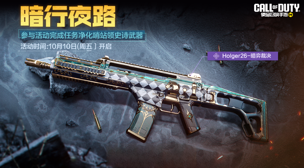 10月10日(本周五),暗行夜路活动神秘上线,战士们参与活动即可领取史诗级武器Holger26-暗弈裁决和史诗级角色斯嘉丽-斑谑幻客。