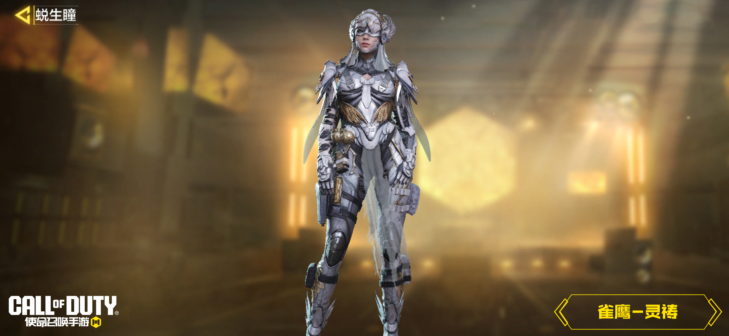雀鹰-灵祷身穿银白与金色交织的金属盔甲,搭配羽翼般的装饰高贵而华丽。