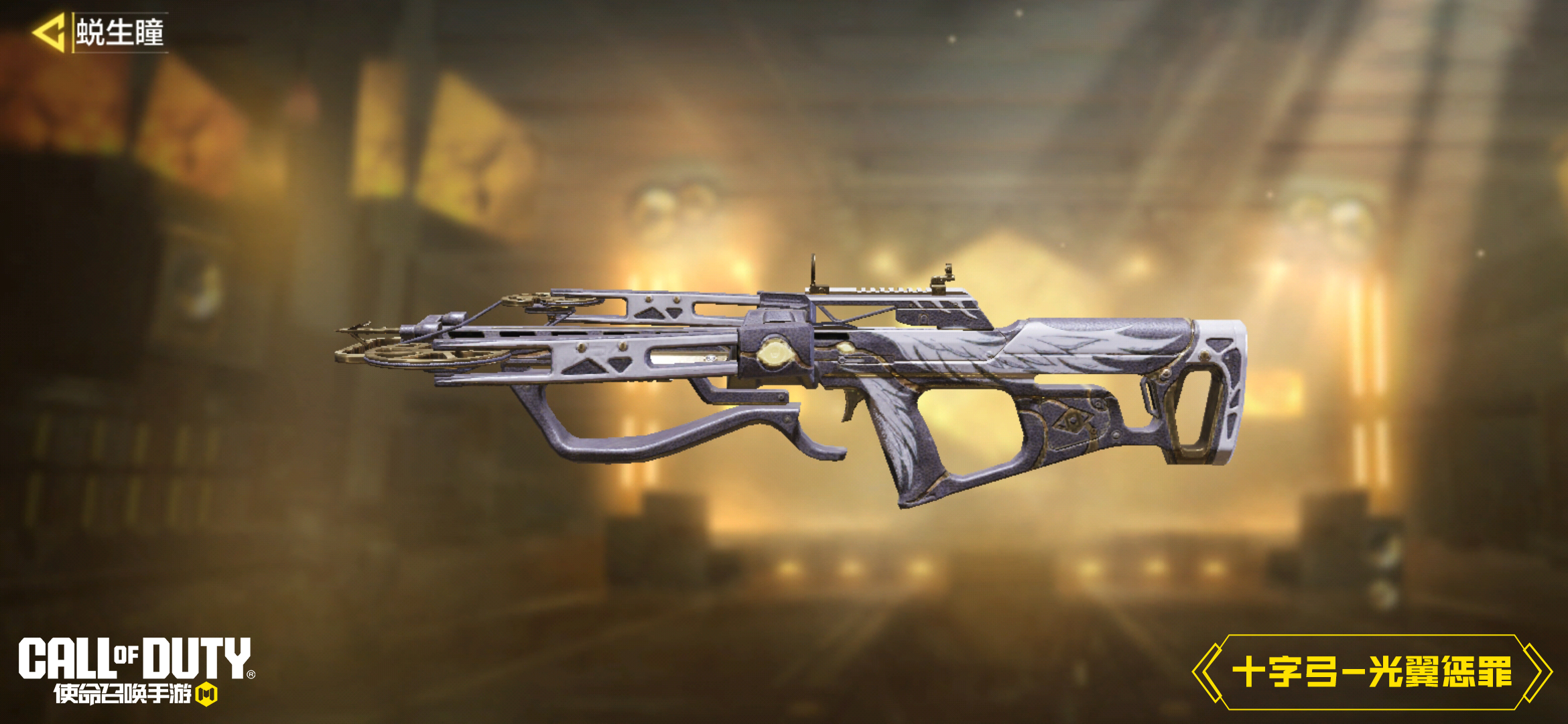十字弓-光翼惩罪以冷峻的银灰色为主色调,枪身上印有银灰色羽翼,整体线条硬朗且机械感十足。