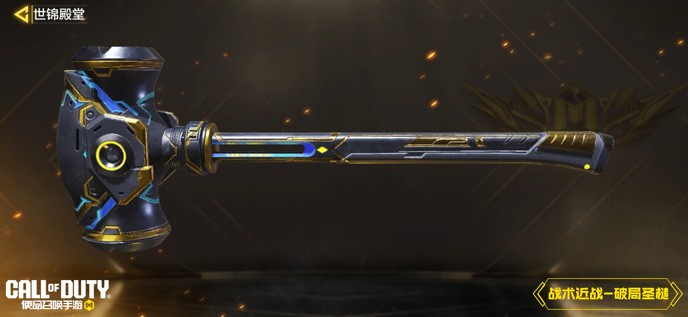 战术近战-破局圣槌的锤头厚重,中央凹陷圆形由金线勾勒,彰显力量底蕴。锤柄修长,蓝金线条点缀,优雅与力量并存。